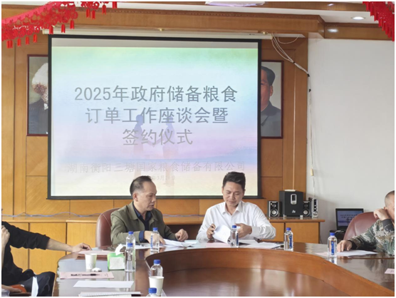 3月26日上午,衡糧集團三塘子公司在三樓會議室組織召開2025年政府儲備糧食訂單工作座談會,邀請了衡南縣、衡陽縣等周邊稻谷實際種植者代表參加洽談并現(xiàn)場簽約。衡陽市發(fā)改委調控科科長萬秋香、副科長周鐵鋼,衡糧集團黨委副書記、總經(jīng)理劉光蘭等出席會議,副總經(jīng)理尹培劍主持會議,三塘公司中層以上干部參加會議。